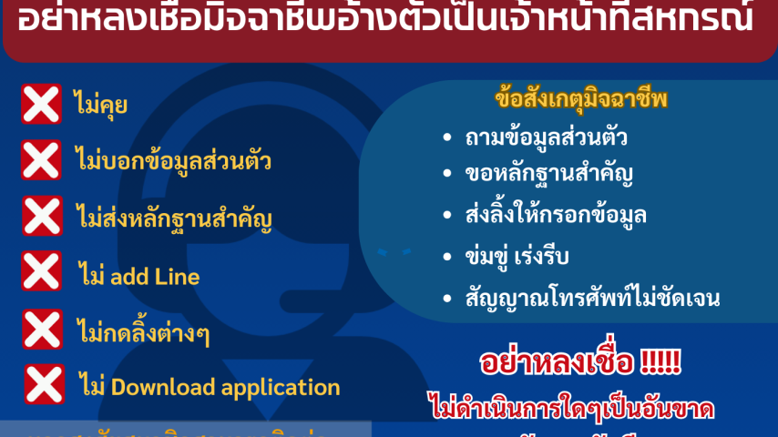 โปรดระวังมิจฉาชีพแอบอ้าง เป็นเจ้าหน้าที่สหกรณ์โทรสอบถามข้อมูล แจ้งเปลี่ยนแปลงผู้รับโอนประโยชน์ อย่าหลงเชื่อเด็ดขาด