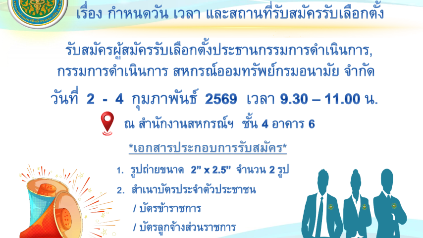 รับสมัครผู้สมัครรับเลือกตั้งประธานกรรมการดำเนินการ,กรรมการดำเนินการ สหกรณ์ออมทรัพย์กรมอนามัย จำกัด วันที่ 2 - 4 กุมภาพันธ์ 2569 ตั้งแต่เวลา 09.30 - 11.00 น.