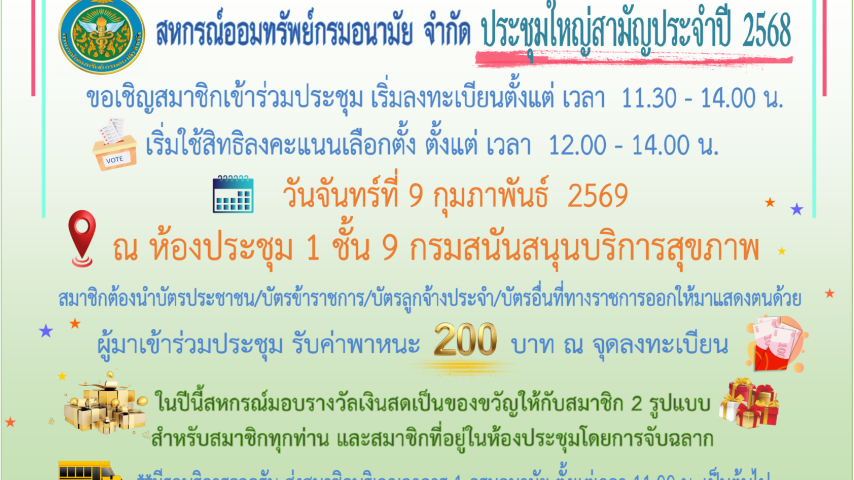 ขอเชิญสมาชิกเข้าร่วมประชุมใหญ่สามัญ ประจำปี 2568 ในวันจันทร์ที่ 9 กุมภาพันธ์ 2569 ลงทะเบียน เวลา 11.30 - 14.00 น. เริ่มใช้สิทธิลงคะแนน เวลา 12.00 - 14.00 น.